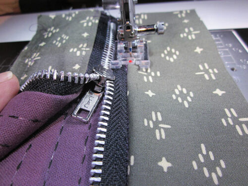 - With the “wings” of the zipper unit wrong sides together to either side (exterior and lining are wrong sides together to either side of the zipper), start with the zipper unit lining side up. Sweep just the exterior strip back under the zipper so the two exterior strips are right sides together, leaving just the one lining strip extending to the right. Edgestitch the lining to the zipper tape. Repeat on the other side.