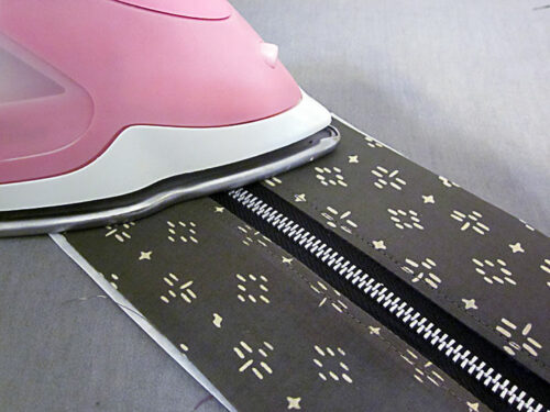 NOTE: The zipper should be about half way open. Stitch to the middle, where you can start to feel you’re approaching the zipper pull. Stop with your needle in the down position. Twist your fabric around slightly in order to access the zipper pull and carefully close the zipper, moving the pull out of the way of the foot. Re-position the fabric, drop the presser foot, and finish sewing to the end. - Press the fabric strip away from the zipper teeth.