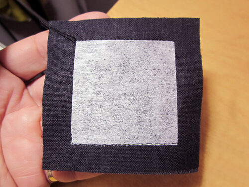 - Center the interfacing square on the wrong side of one of the linen squares so there is ½” of fabric showing beyond the interfacing on all four sides. Following manufacturer’s instructions, fuse in place.