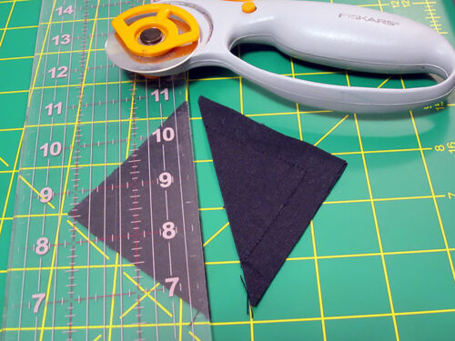 - Slice the sewn square in half along the diagonal.