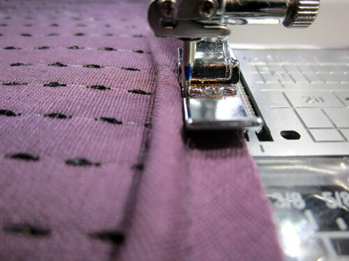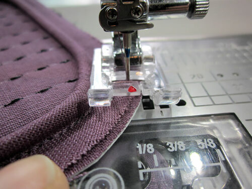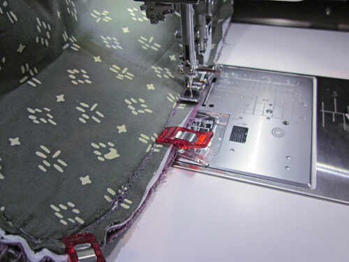 - Stitch the bias binding to the seam allowance all around. The presser foot is your choice; we used a Satin Stitch foot. Remember, you are stitching only through the seam allowance; do not stitch onto the main pouch itself. Repeat to bind the remaining seam allowance on the opposite side.