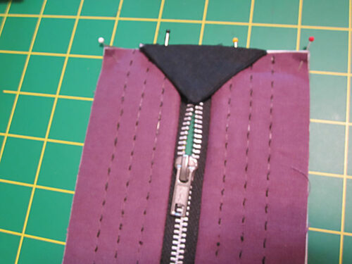 - Using an approximate ½” seam allowance, stitch the two short seams through all the layers. We say “approximate” because your goal is to stitch just beyond the zipper stops at the top and bottom, which might be slightly narrower or wider than ½”.
