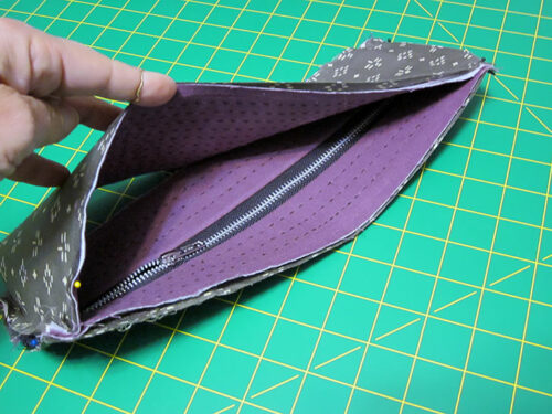 ONE MORE NOTE: The zipper pull tabs should be loose from the side of the pouch, which is what needs to happen so they can act as pulls to open and close the zipper. However, if you want them to sit more flat, you can use a hand needle and matching thread to very lightly tack them in the down position along the top of the triangle. Work from the inside of the pouch, hiding the stitch through just the back layer of each tab.