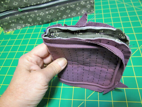 - Here’s a shot looking down into the pouch with the first panel stitched in place.