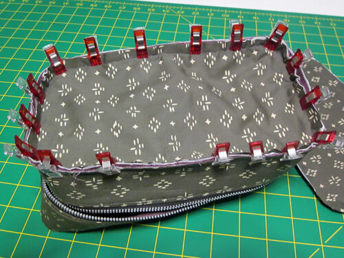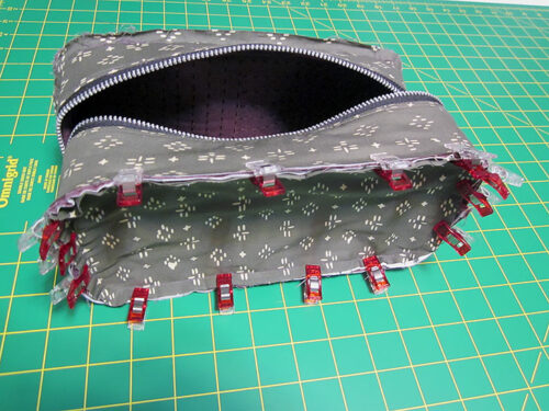 - Align the quarter point pins of the front panel with the matching pins of the loop. Pin through all the layers at these points first, then fill in around the circle. We used clips instead of pins – either option works fine.