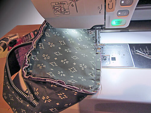 - This second panel will be a bit more challenging to wrangle under the presser foot because you no longer have an open side. However, by making sure the zipper is all the way open and working to flatten the layers, you should be able to go all the way around without a problem. As with all things that may present an initial challenge, go slowly and stop – with your needle in the down position – to adjust the layers as needed.