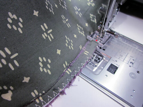 NOTE: This was our chosen finish but it is not mandatory. You could also choose to use a simple machine sewn finish as you did above with the short joining seams of the side loop. A standard zig zag or an overcast stitch with the Overedge foot are both good options.