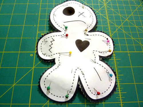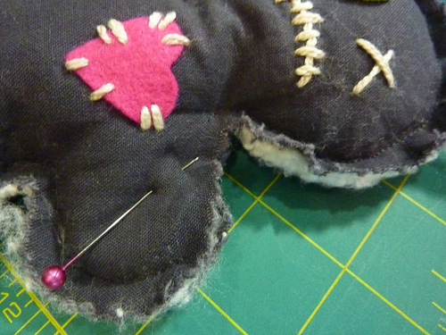 - Pin in place all around. Refer to the original paper pattern to place stop and start pins at either side of the opening you’ll want to leave for stuffing and filling. This opening is at the top of the zombie’s right arm.