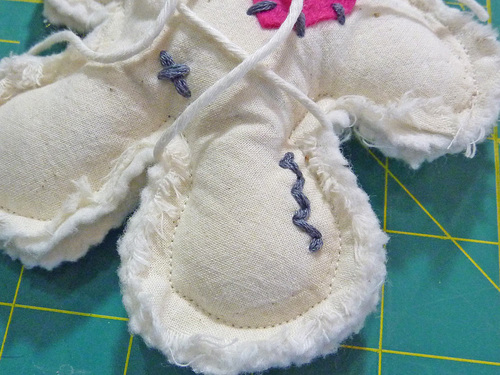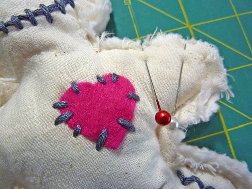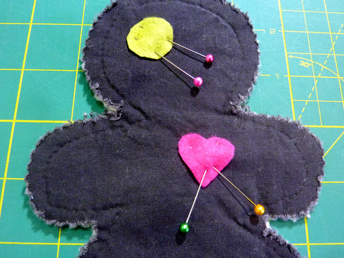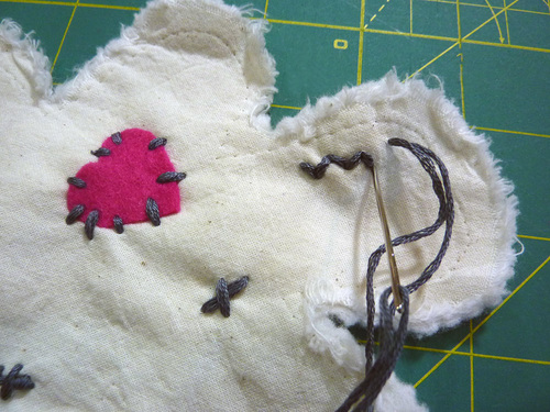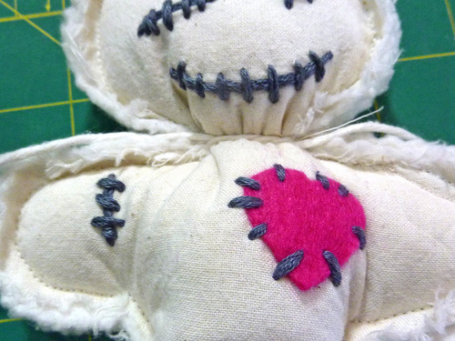 - You’ll use a running stitch as well for the “surgical stitching” accents on their arms and legs and to stitch their hearts in place.