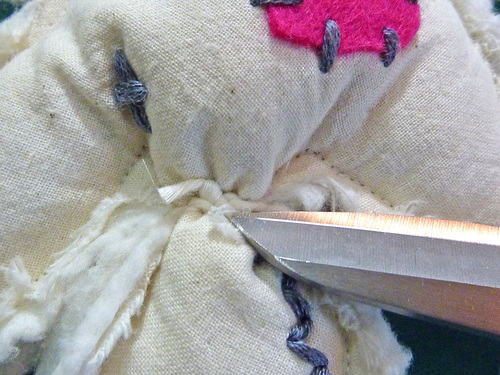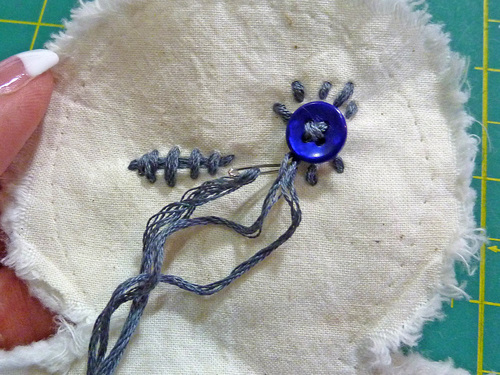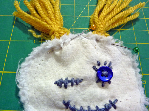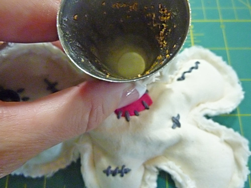 - On Odilia, her button eye is stitched in place first, then the floss eyelash accents are added around it.