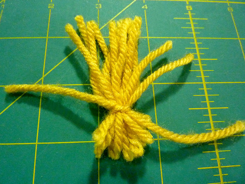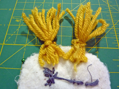 - Odilia’s pigtails are made from a dozen short lengths of yarn secured with a yarn wrap around one end.