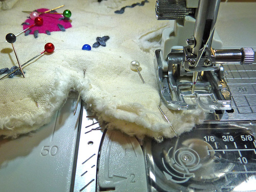 - Make sure the machine is still threaded with thread to best match the exterior fabric in the top and bobbin. Shorten the stitch length so you will have a nice tight stitch to contain the filling. A shorter stitch is also usually best for stitching curves.