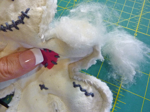 - Stuff first with the lightweight filler (we used bamboo stuffing). Pull apart the fibers of the stuffing so it has maximum loft. You just need a small amount in each foot and hand as well as around the outer edge of the head. A long knitting needle or chopstick can help you gently push the stuffing into position.