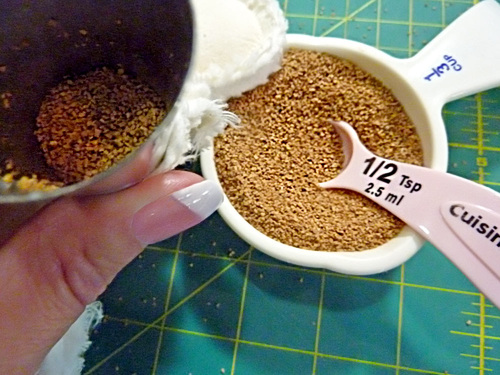 NOTE: The pincushion should not be so tightly filled that you can’t gently push the shells and stuffing to one side in order to give you enough room for your presser foot to stitch. - Tie a length of cotton twine around the top of each leg.