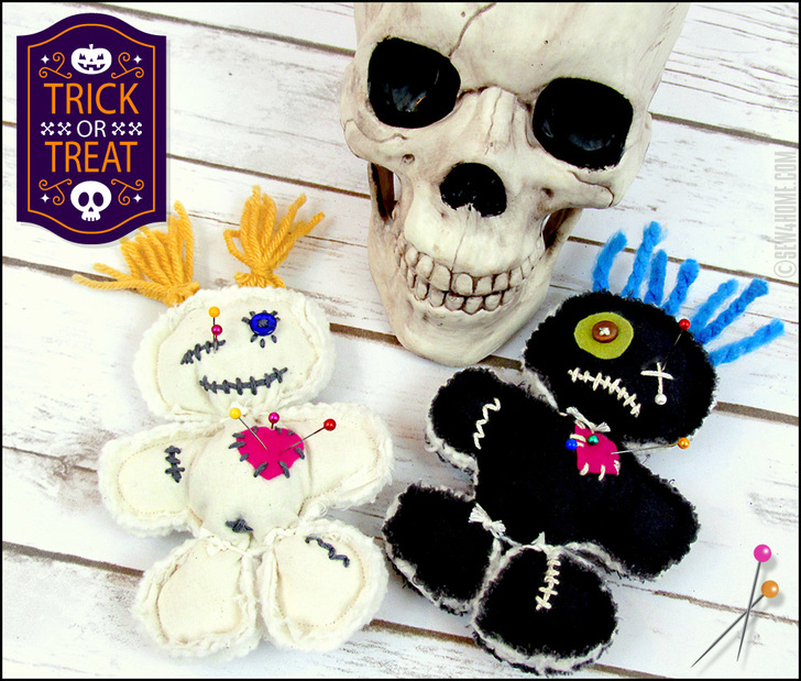 We worked with some plain cotton scraps from our stash, choosing the excellent Halloween colors of Mummy Wrap White for Zombie Odilia and Ghoulish Gravestone Gray for Zombie Cornelius. With just a few bits of floss, felt, and button accents, you can give your zombies their own unique personalities.